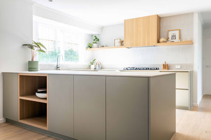 This beautifully crafted cabinetry project includes a kitchen, dining room, library, workspace, and laundry. It was a joy to be part of this contemporary refresh by interior designer Assembly Interiors. The project blends fresh design with natural warmth, perfectly suited to this nature-loving family's home. The sleek, Laminex green doors in an earthy tone and are accented by round handles, adding an elegant retro touch. The warm wooden accents tie the rooms together, creating a balanced and inviting atmosphere. Each space boasts openness and modern livability, providing an environment where the family can gather and enjoy everyday moments. Clever hardware choices, high-quality materials, and exceptional craftsmanship ensure that the cabinetry not only looks beautiful but also stands the test of time, enhancing the functionality and style of the home.